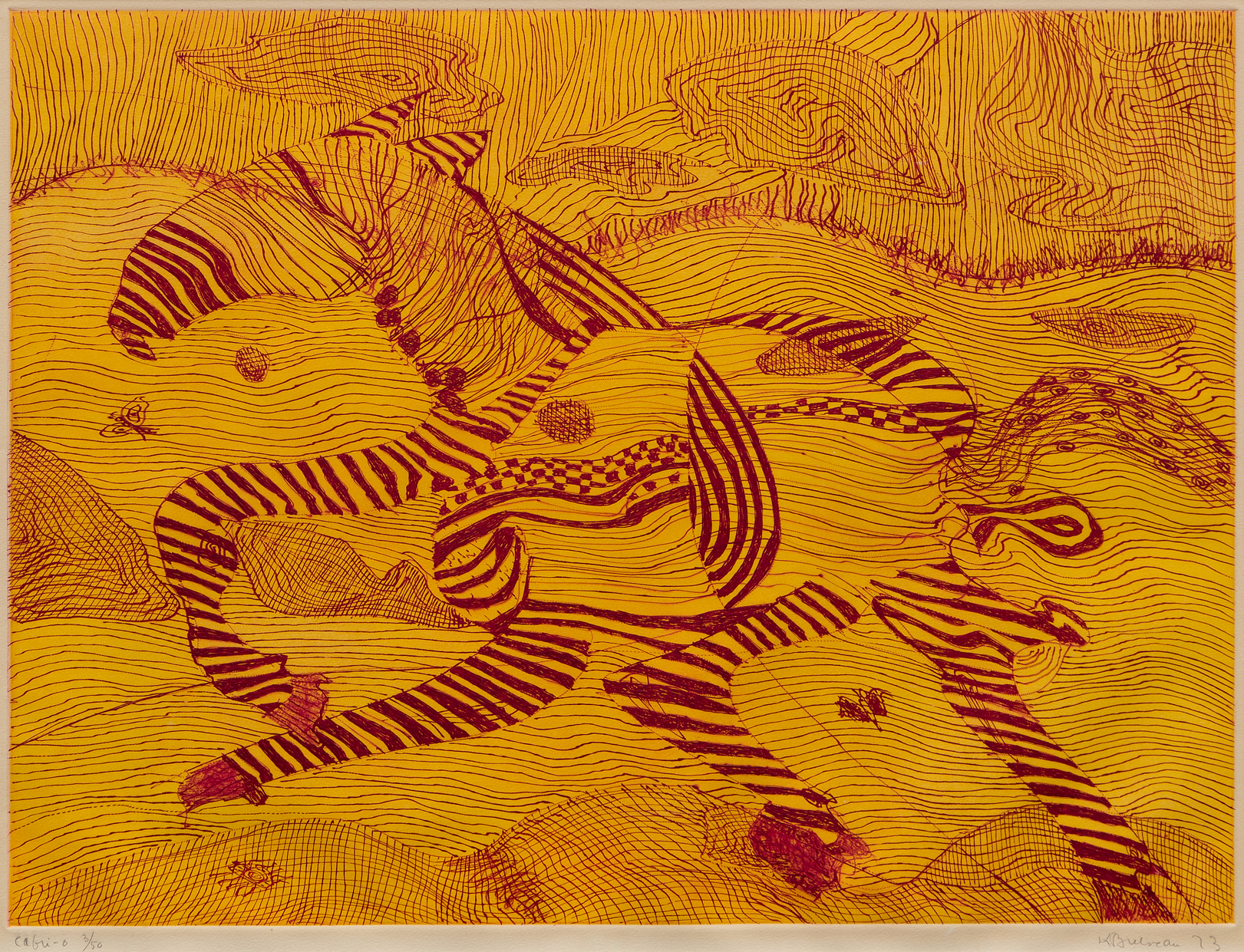 Signée et datée au crayon « K Bruneau 73 » dans la marge inférieure à droite, titrée et numérotée « Cabri-o 3/50 » dans la marge inférieure à gauche