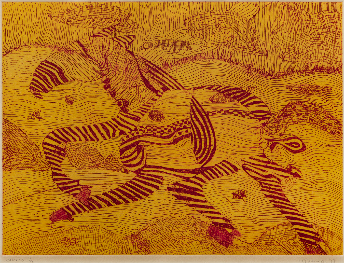 Signée et datée au crayon « K Bruneau 73 » dans la marge inférieure à droite, titrée et numérotée « Cabri-o 2/50 » dans la marge inférieure à gauche
