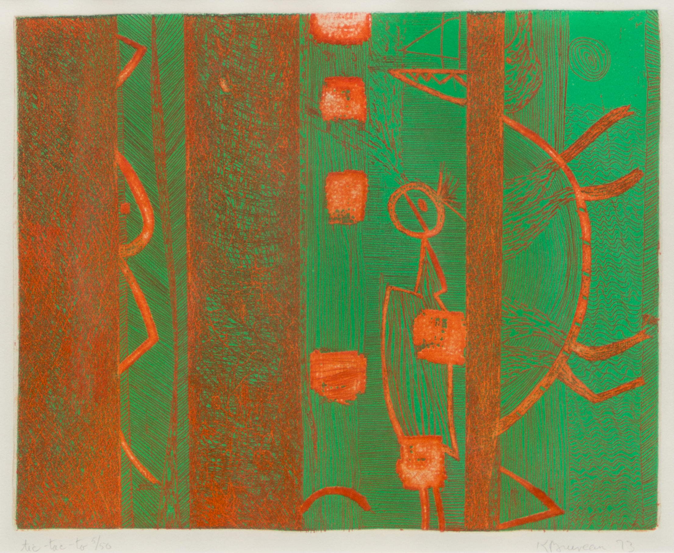 Signée et datée au crayon « K Bruneau 73 » dans la marge inférieure droite, titrée et numérotée « tic-tac-toe 5/50 » dans la marge inférieure gauche